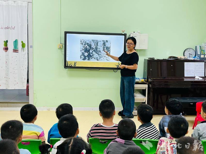 当屏幕上出现战火纷飞的画面、听到悲壮的音乐、看到英勇的战士们时,孩子们的神情变得专注而凝重。中班的乐乐(化名)指着屏幕问:“老师,他们的家是不是被坏人弄坏了?”得到肯定的回答后,他瘪着小嘴,眼泪在眼眶里打转。大班的几名小朋友在看到民众逃亡的场景时,忍不住小声抽泣起来,用小手擦拭着不断涌出的泪水。“我很难过……他们太可怜了。”一位小朋友哽咽着对老师说。