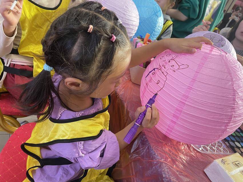 活动共分为三个环节。开场环节,主持人向大家介绍了双节同庆的背景,并鼓励家长和孩子在灯笼创作中加入五星红旗、月亮、玉兔、月饼等富有节日意义的元素。随后,亲子DIY正式开始。孩子们充分发挥想象力,有的在灯笼上描绘出清雅的桂花,有的画出硕果累累的柿枝,还有的以玉兔和明月为题进行创作。四十分钟后,一盏盏独具匠心、色彩鲜艳的灯笼陆续完成。手捧自己亲手制作的作品,每个孩子脸上都绽放出喜悦的笑容。