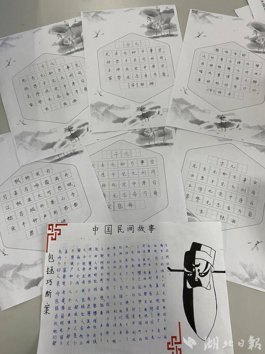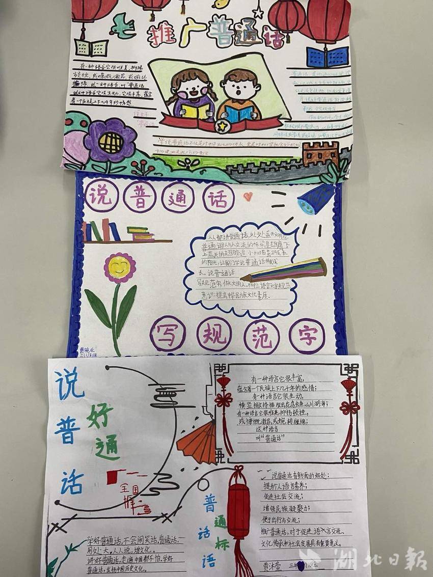 三年级学生化身“推普宣传员”,通过手抄报创作的形式传播推普语言知识。他们围绕“普通话的由来”“趣味方言与普通话对比”等主题,用彩笔勾勒出拼音字母、中华经典诗句,搭配“说好普通话,朋友遍天下”等标语,制作出一幅幅图文并茂的作品。