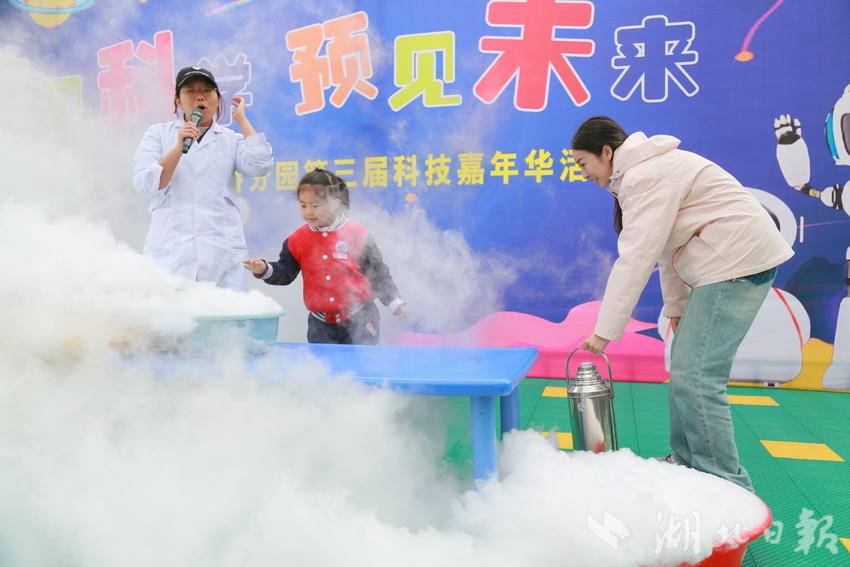 尽管天气微寒,但活动现场的热情却丝毫不减。一场精彩的“干冰科学秀”瞬间点燃了全场,云雾缭绕的景象引得孩子们惊呼连连;震撼的“空气炮”打出一个个烟圈,让抽象的科学概念变得可视可感。惊奇的欢呼声、热烈的掌声此起彼伏,科学的种子在这一刻悄然种下。