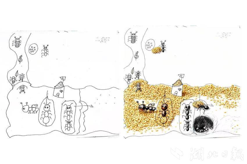 老师又通过图片、动画等形式,向孩子们讲解了蚂蚁的结构、种类以及蚂蚁的巢穴。孩子们听得津津有味,拿起画笔在画纸上圈圈画画——先画蚂蚁的样子,再用画笔给蚂蚁建造“小房子”,有的用箭头标出蚂蚁“搬货路线”,......从模糊的小点点到画出蚂蚁的三段身体,每一笔都藏着他们一点点发现的蚂蚁小秘密,就像把放大镜下的世界装进了画册里。