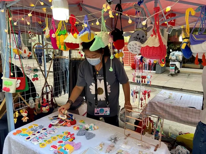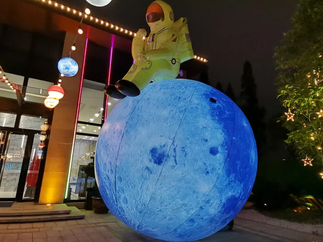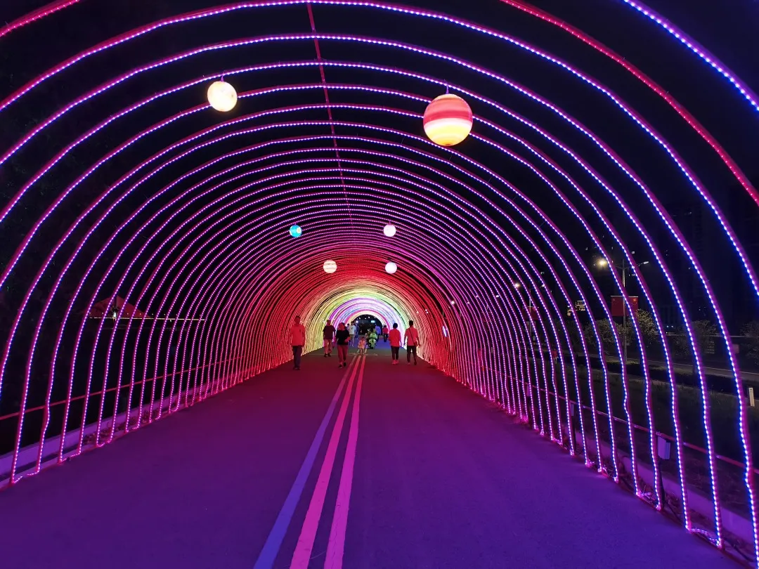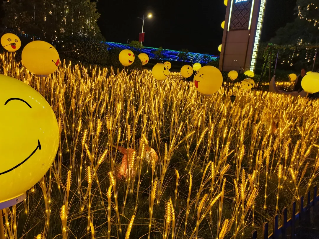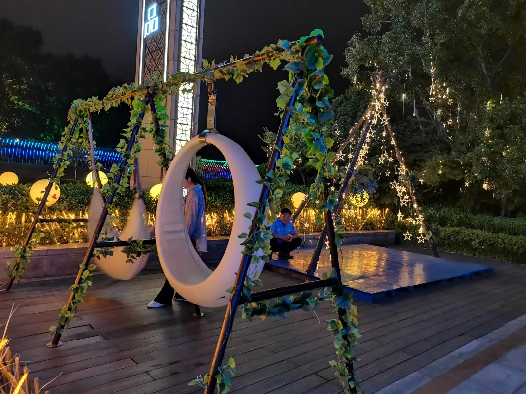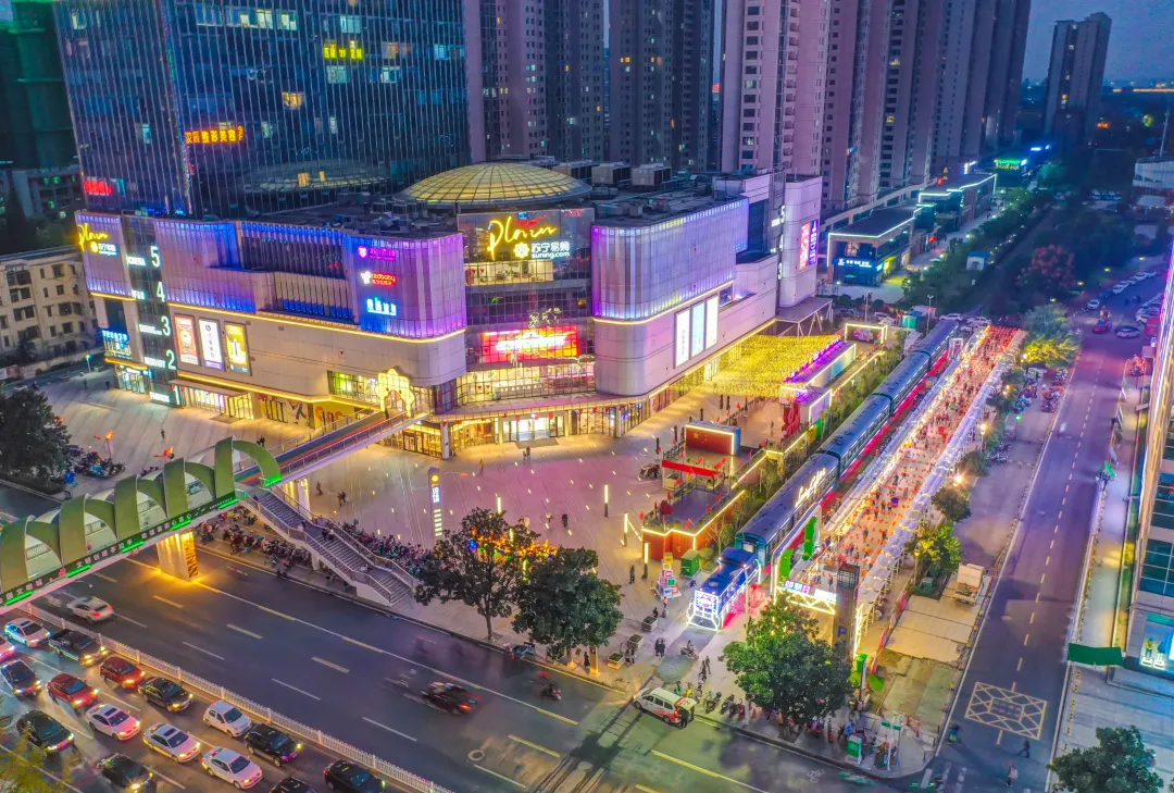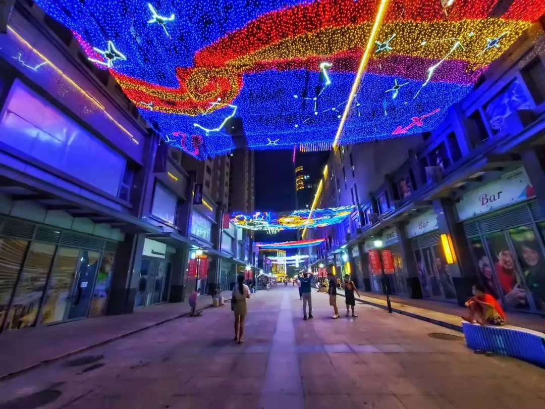 樊城区天元四季城开放室外步行街“星空夜市”,星空集市的彩灯造型出自梵高的画布油画《星空》、明黄的月、闪耀的星、宁静广阔的天空,因“星空”主题灯光秀,这处步行街成为网红打卡地。