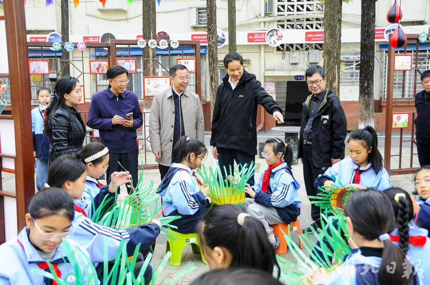 调研组一行抵达学校后,在竹条中心小学校长冯浩引导下,先后走进“王郧襄”烈士展厅、阳光运动操场、“竹”文化展示厅、教职工之家等地。在烈士展厅,察看陈列资料,了解学生主题班会、烈士精神宣讲等活动情况;在阳光运动操场,察看学生竹竿舞、抖空竹训练,询问“阳光运动”课程与体质监测数据,观看抖空竹花样表演并认可传统体育融入课间的做法;在“竹”文化展示厅,了解“竹品育人”校本课程、校园竹景观及学生竹编竹画等文创,驻足欣赏作品并称赞地方特色与育人目标相结合;在教职工之家,与教师交流教研帮扶、心理关爱,察看功能布局,询问教师专业成长支持与心理健康疏导机制,感受“温馨校园”成效并不时记录办学特色。