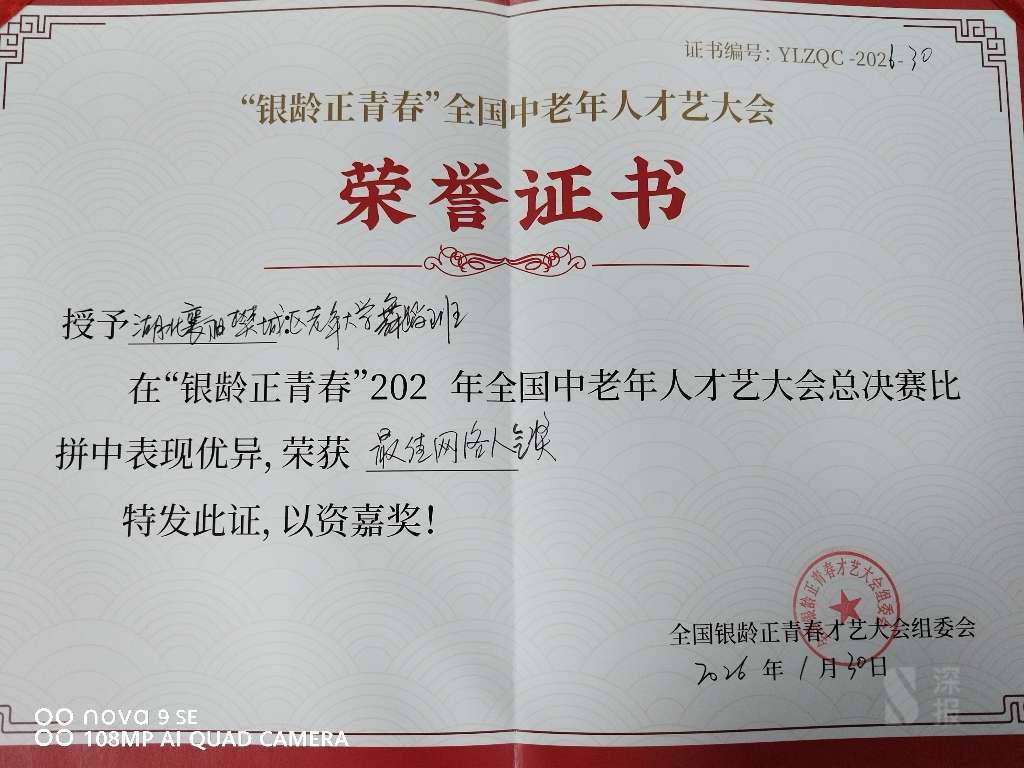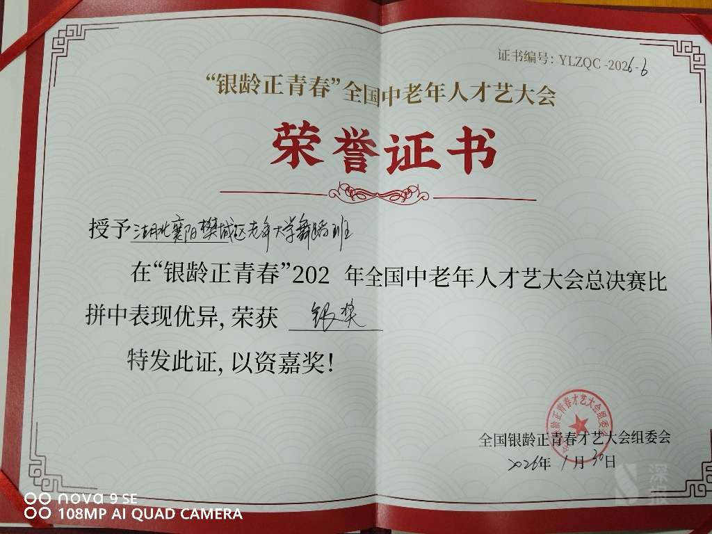 本网讯(通讯员 赛玉惠)1月30号上午,由中国广播艺术团(中国电影乐团)主办的“全国银龄正青春2026年首届全国中老年人才艺大会总决赛”颁奖典礼在北京云演艺中心展播大厅盛大举行。在这场汇聚全国中老年才艺精英的盛会上,湖北省襄阳市樊城区老年大学舞蹈表演系凭借舞蹈《再唱山歌给党听》展露头角,一举夺得“银龄正青春"2026年首届全国中老年人才艺比拼总决赛最佳网络人气奖、舞蹈表演银奖。
