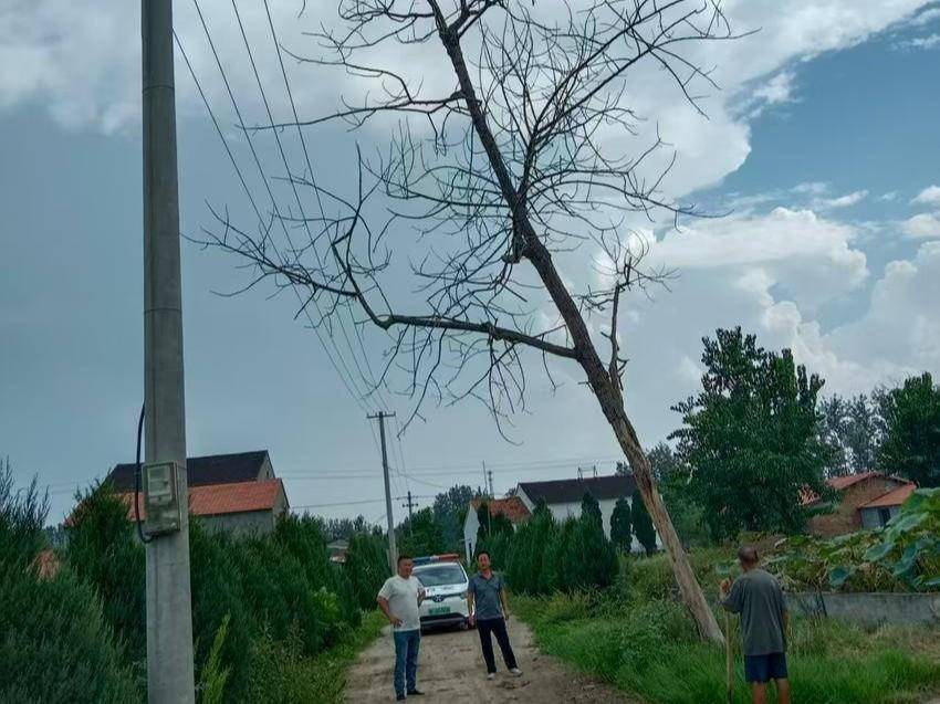 镇应急办涂主任与肖庄村张书记得知情况后,第一时间赶赴现场开展勘察。为防止意外发生,二人当即在周边放置安全警示标识牌,提醒过往村民与车辆绕行避让。同时,迅速联系专业人员携带工具到场,现场部署锯除清理工作。