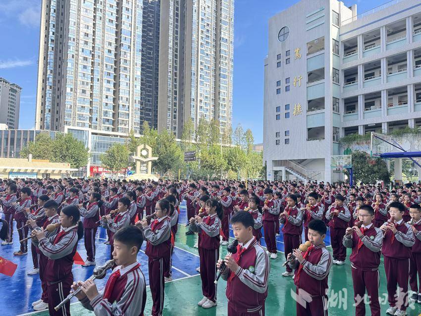 9月30日上午,五、六年级全体学生齐聚操场,身着整齐服装,佩戴鲜艳红领巾,以千人葫芦丝合奏《东方红》的形式,表达对祖国的深情祝福。演奏场面壮观,旋律激昂,展现了活力少年的艺术素养与集体凝聚力,将庆祝活动推向高潮。