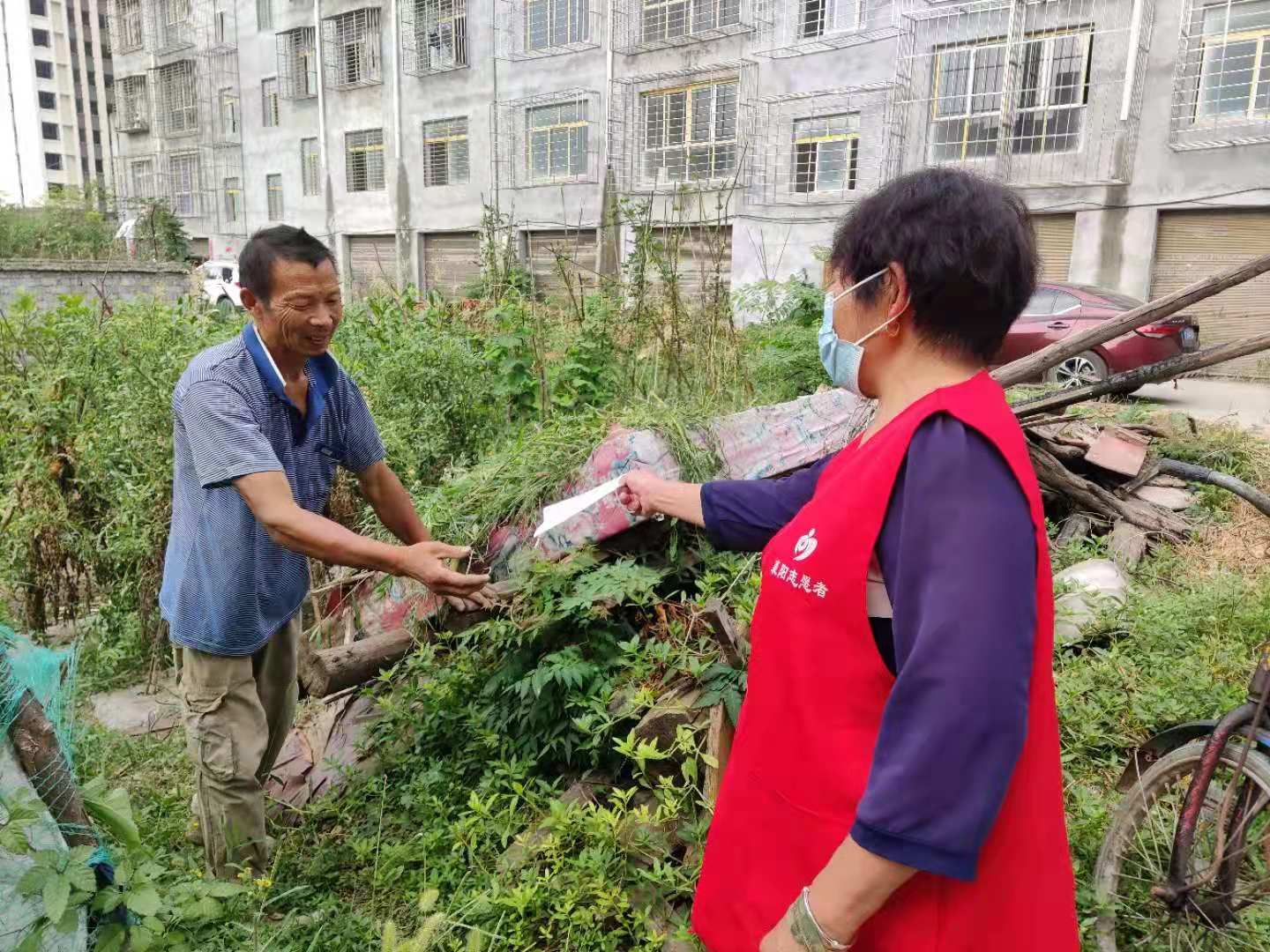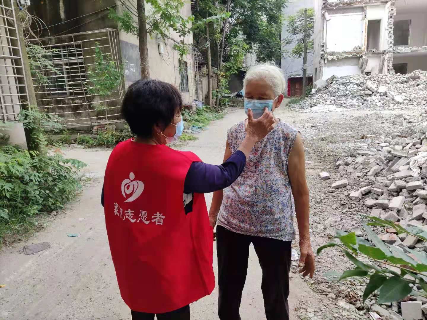 卞文珍个头不高,两年前轻微中风导致腿脚不太方便,走路一深一浅。近日,她志愿进行防疫宣传,随同社区网格员一起走家串户,为居民讲解疫情防控知识,督促居民佩戴口罩,提醒大家做好个人防护。