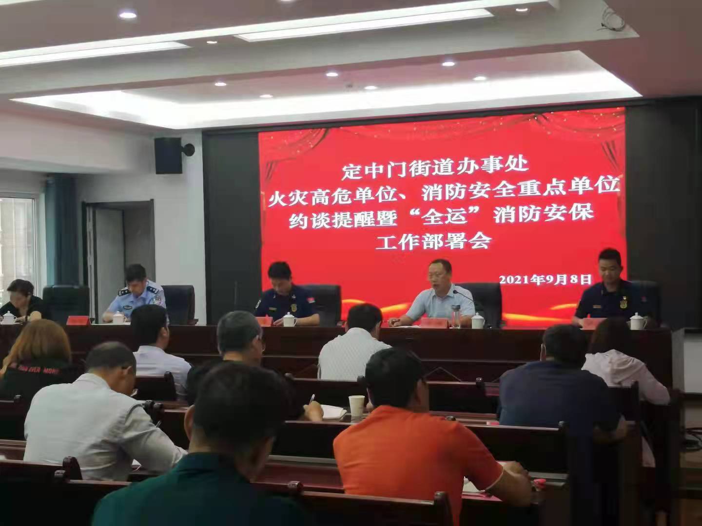 本网讯(通讯员 包艳丽 胡海涛)9月8日下午,定中门街道办事处联合樊城消防大队组织召开火灾高危单位、消防安全重点单位约谈会暨“全运”消防安保工作部署会。区消防救援大队、定中门派出所、定中门街道办事处、火灾高危单位、消防安全重点单位、十小场所代表、各社区主任及网格员、长征路消防救援站防火班共计80余人参加会议。