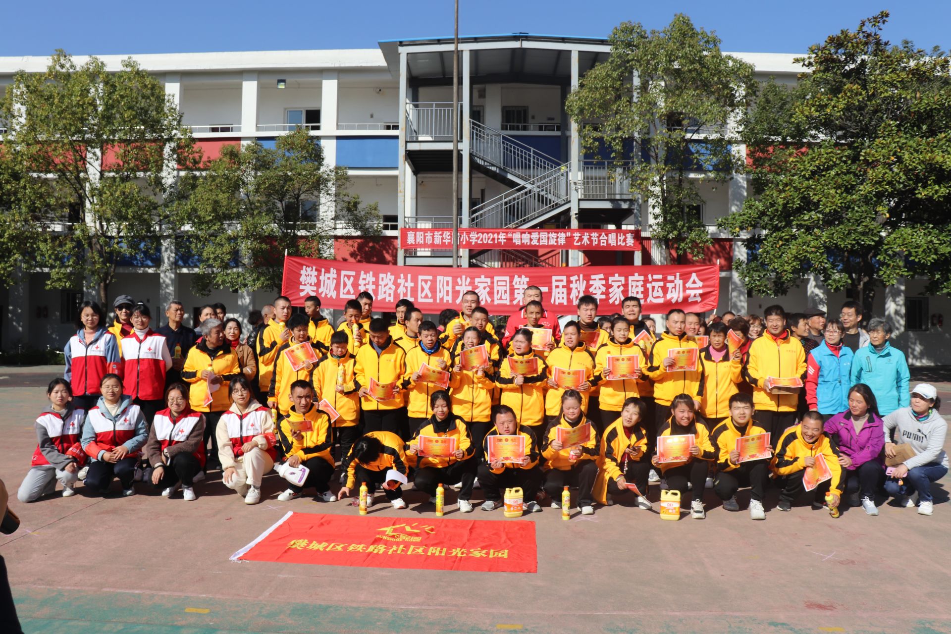 本次运动会设有运送篮球、背靠背夹气球、跳绳、拔河、百米接力赛等项目,阳光家园“特奥体操队”助阵表演了第九套广播体操,“特奥妈妈”王华革老师为运动会致辞。