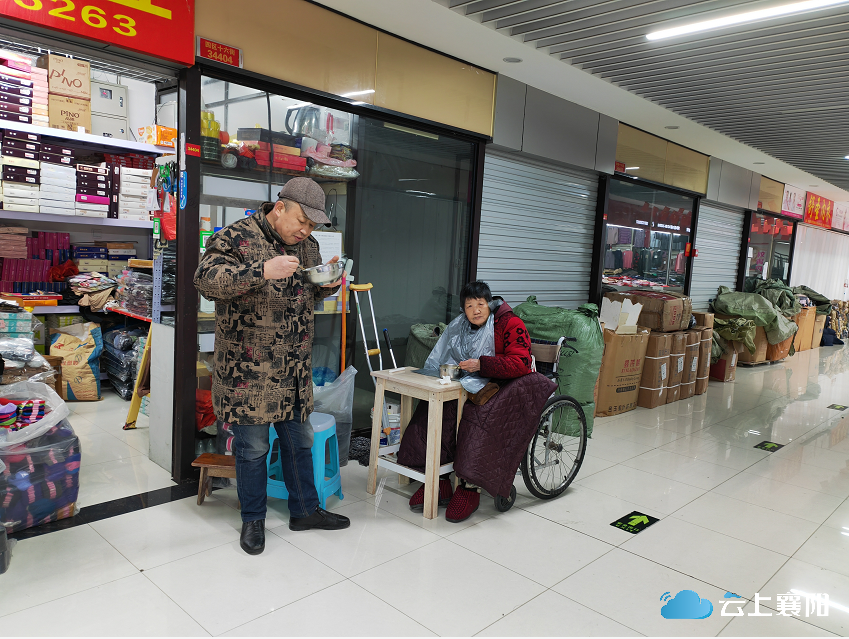 张卫东17岁就来了襄阳,靠在小商品市场开店为生。2014年,妻子生病去世,张卫东独自经营着这间十几平米的门店。这几年受电商冲击,生意并不好做,如今要照顾母亲,店还得开。做生意的间隙,张卫东要陪母亲在走廊上锻炼几次。苏玉娥坐久了,不愿意动,张卫东像哄孩子一样哄她走路。