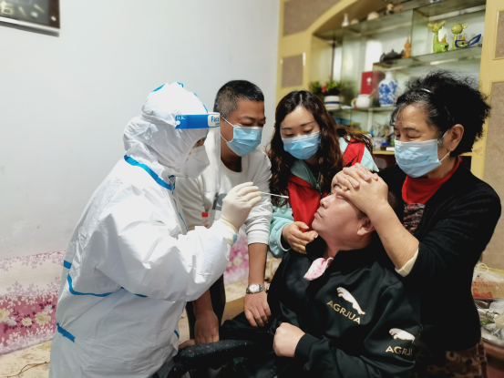 4月14日上午,旭东路社区的志愿者和医护人员来到清河小区瘫痪卧床的邓勇的床边,按照规范流程,为他采集了咽拭子。随后,一行人又继续赶往下一户待检居民家中。