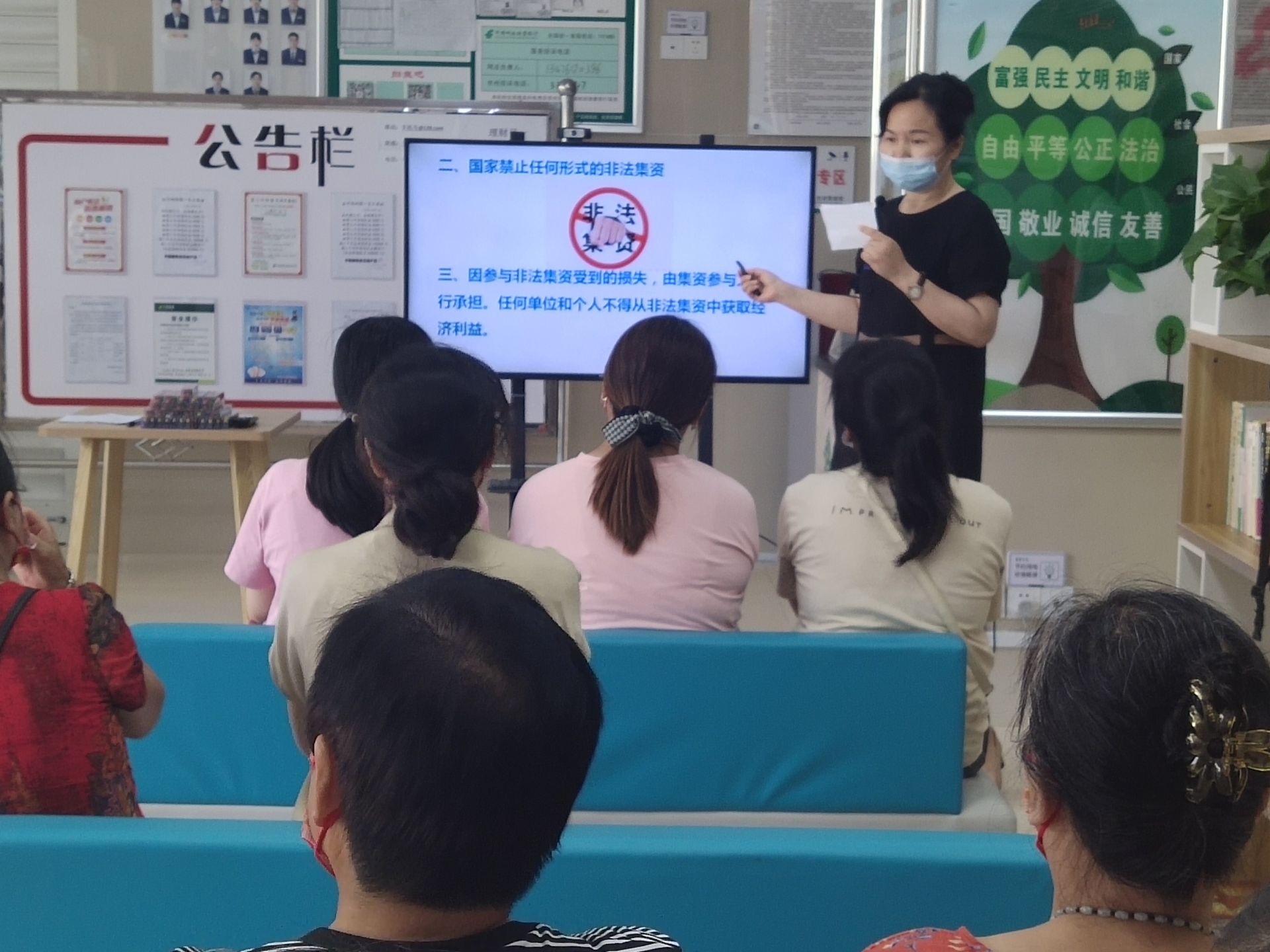 活动中,社区律师杨汉霞向居民讲解《防范和处置非法集资条例》,介绍了非法集资的特征、涉及的法律责任、主要的表现形式;社区民警肖兵给大家讲非法集资真实案例,宣传法律知识,课堂中还引导社区居民如何识别非法集资、防范非法集资。接着,社区工作人员通过“火眼金睛”有奖答题形式,进一步跟大家深入探讨,居民们踊跃作答,竞答现场气氛热烈。同时,还向辖区个体商户积极发放《襄阳市创建全国法治政府建设示范市倡议书》60余份。