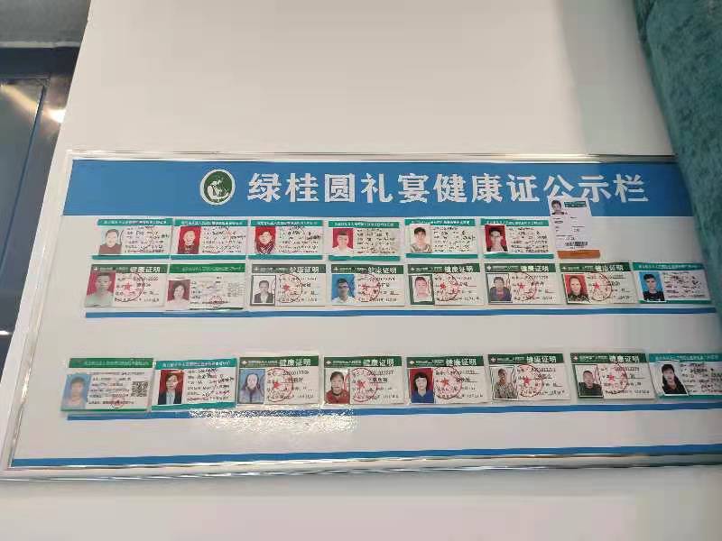 绿桂园酒店经创文工作指导后,将后厨进行改良,划分操作区域,台账清晰,工作人员将健康证清晰展示在公示栏中,厨房名厨亮灶,炒菜的锅具干净竖立无水渍,餐盘分类摆放,在配菜区熟食、青菜、肉类案板菜刀分开使用,餐饮具消毒柜配备齐全,食品原料都在保质期内,蔬菜类当天采购,配备单独的面点房。