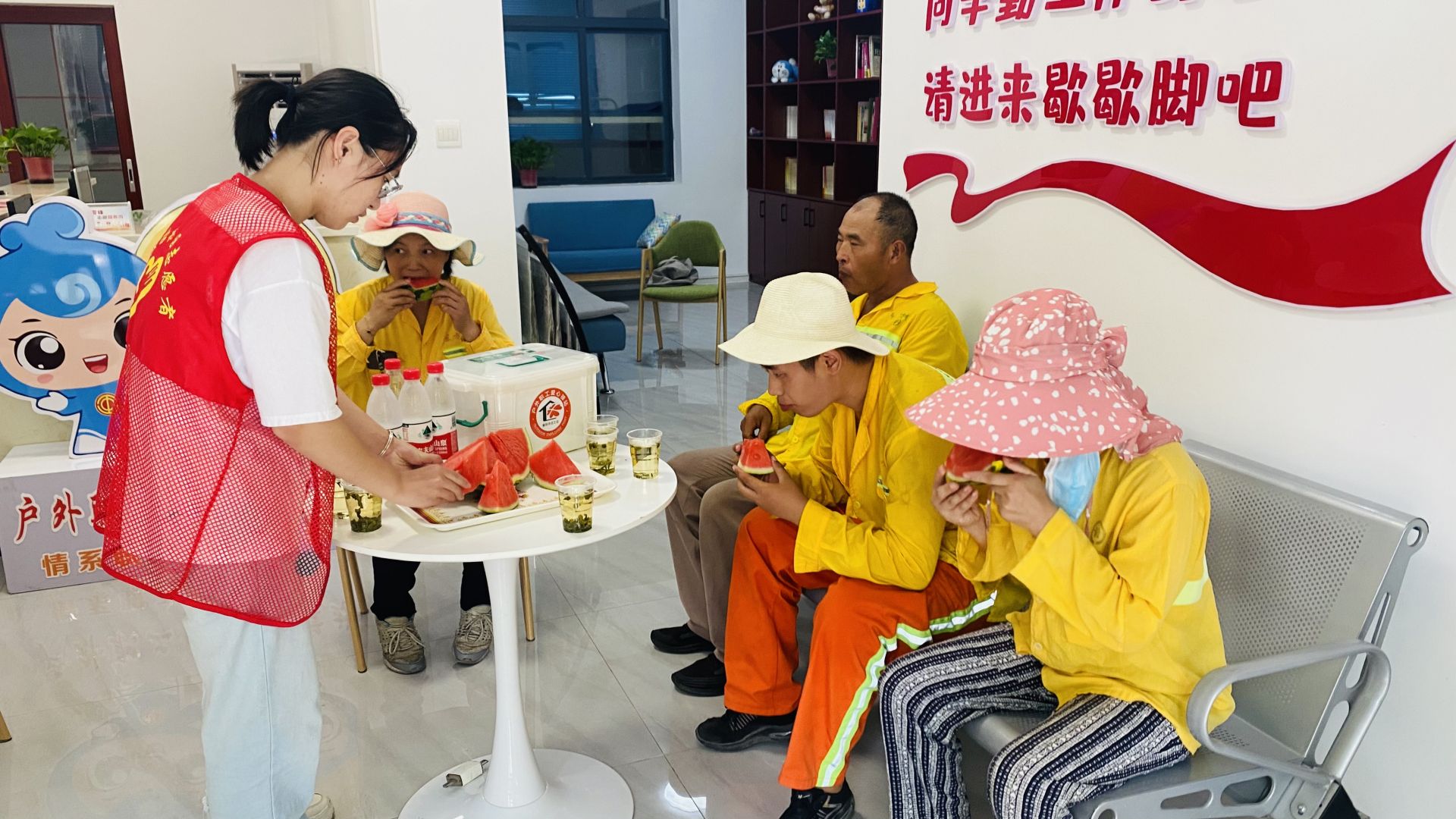 最近天气持续高温,夏家台社区长征路红色驿站每天上午八点半准时开门,泡好茶、准备好绿豆汤、冰镇矿泉水、瓜果等邀请环卫工人、快递小哥、城管、交警等户外工作者进驿站避暑。驿站的志愿者热情地为他们端上茶水,递上西瓜,盛上绿豆汤,让他们在炎热的气温下,感受丝丝凉意。