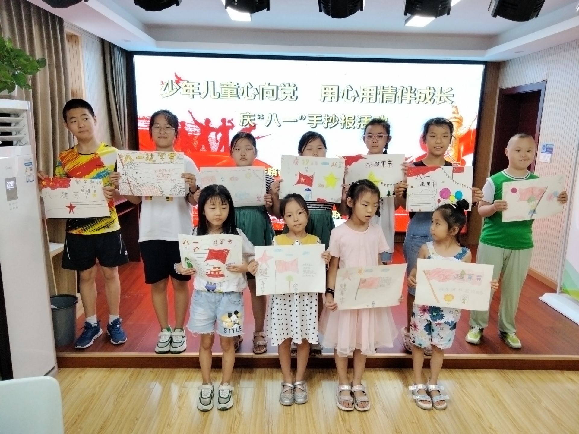 社区工作人员引导小朋友们通过绘画和文字的形式来描绘他们心中的建军节,抒发他们对祖国和军人的感恩、敬畏之情。小朋友们一笔一划用心勾勒着,有五星红旗,有天安门,还有万里长城。他们用发散的思维,写与画的结合,巧妙的色彩搭配,诞生出一幅幅美妙的手抄报。