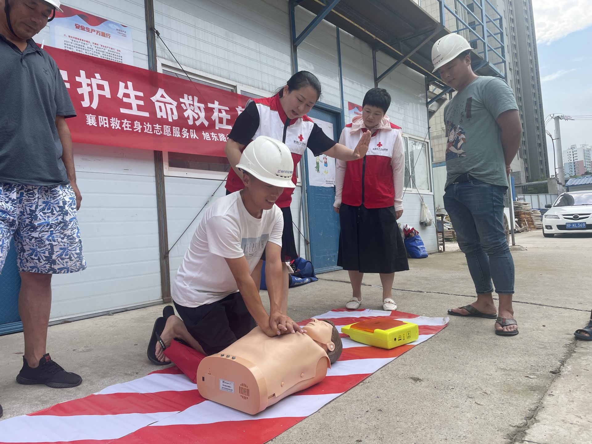 本网讯(通讯员 张玲 顾越)生命至上,安全第一。7月21日上午,旭东路社区红十字服务站和襄阳救在身边志愿服务队走进辖区的建筑工地滨江正荣府项目,开展“急救知识进工地,守护生命就在身边 ”安全救护知识培训活动。红十字会志愿者徐媛媛向一线的建设工人们普及了心肺复苏、紧急止血、包扎要领等应急救护知识,共15余名工人参加。