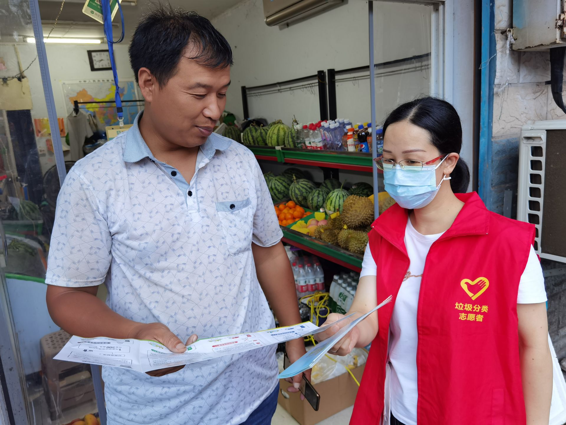 “双报到”党员在辖区内向居民、商户派发垃圾分类倡议书和分类投放指南,讲解生活垃圾的分类类别、投放方式以及厨余垃圾的处理方法,进一步引导居民从环境卫生、文明生活的角度出发,杜绝乱堆乱放、混投混装,增强居民垃圾分类的意识。