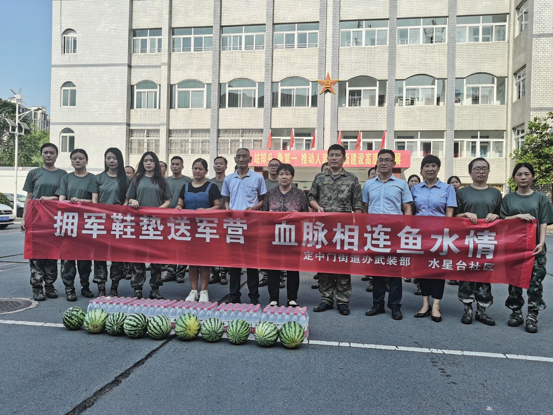 定中门街道武装部长龚新星看望慰问参加军事培训的辖区民兵,为大家鼓气加油并送去水果饮料等慰问品和降暑用品。
