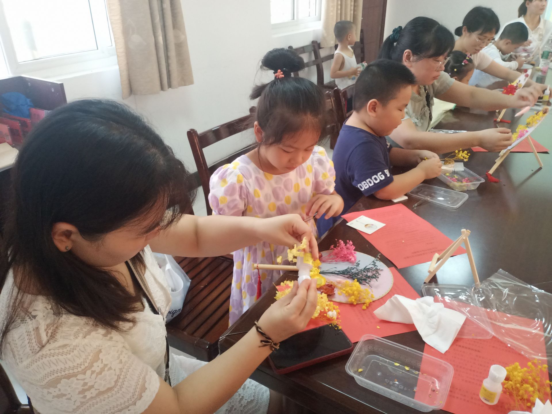 活动现场,工作人员为大家分发了空白扇面、各色干花、胶水、剪刀等手工材料,为大家展示不同干花团扇的效果图,教大家如何设计扇面构图、如何配色、如何搭配,并鼓励小朋友们在承袭传统的同时融入创新,成就属于自己独一无二的艺术品。经过一个多小时的努力,原本空白的扇面瞬间花团锦簇,一幅幅清新淡雅或浓烈艳丽的高颜值团扇作品呈现在眼前,大家互相欣赏,互相交流,每个人脸上都洋溢着喜悦的神情,整个活动室充满了欢乐的气息。