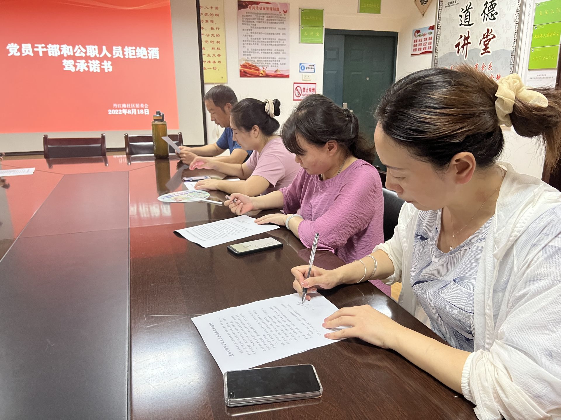 本网讯(通讯员 郑静)8月18日上午,丹江路社区召开“党员干部和公职人员拒绝酒驾承诺书”签订会议。会上,社区工作人员都签订了拒绝酒驾、醉驾承诺书,社区书记要求大家都要珍爱生命,拒绝酒驾、醉驾,吃饭喝酒不开车,一定要把这种文明交通理念在辖区内加大宣传,使居民人人皆知。