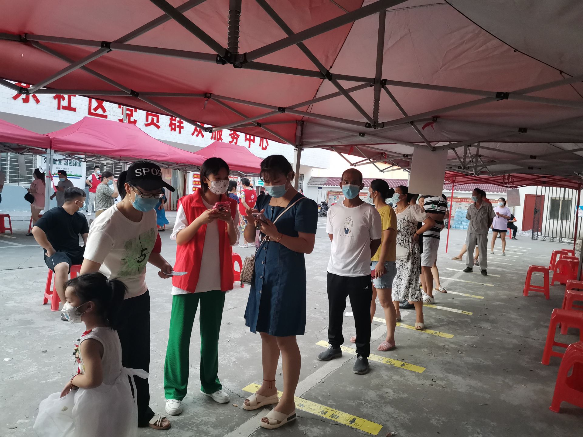 连续三天室外40度的高温,返乡大学生们按照社区干部的要求负责维持现场人员秩序,给现场群众发放口罩,采集核酸检测登记信息,对于没有手机的老年人和小孩,志愿者们详细告诉他们如何用身份证信息登记,保证快速有效地开展检测工作。