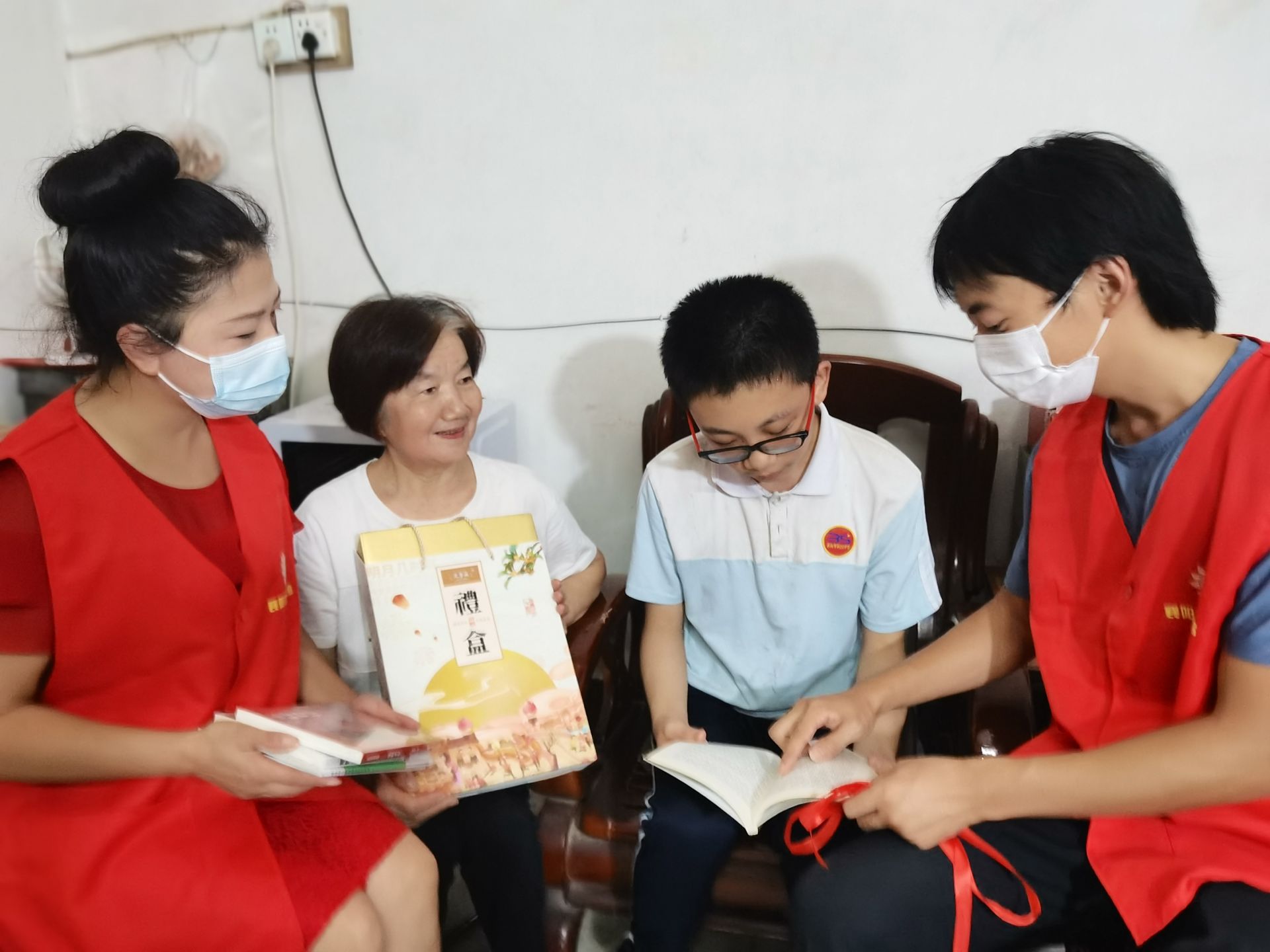 9月8日上午,机坊街社区志愿者代表和点爱协会志愿者代表早早就准备好了中秋的礼品,为读书会优秀学员和贫困家庭送上红书、二十四节气等读本和手工制作的月饼。每到一户,志愿者们都给孩子们讲动人传说、读优美诗句,陪老人们追忆过往,品尝月饼,大家都很高兴,感激之情溢于言表。