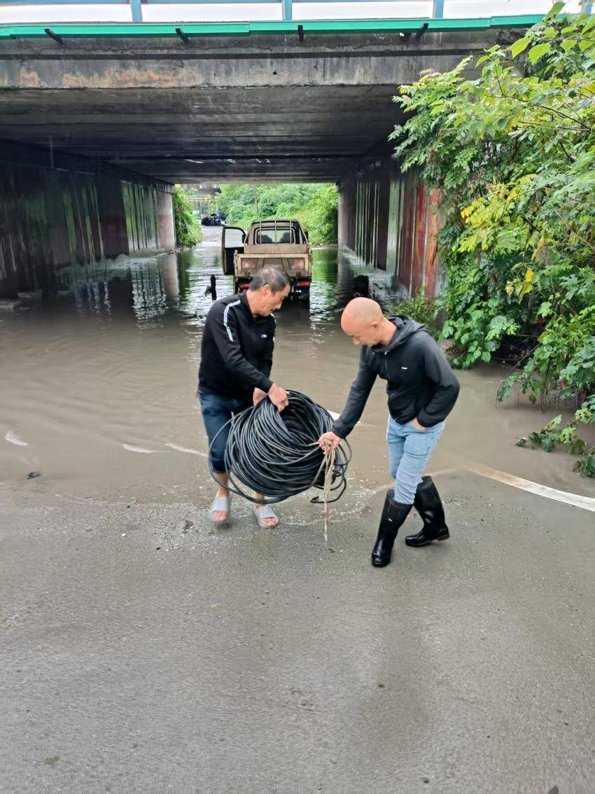 志愿者们手持工具各司其职,分工体系井然有序:部分人员专注清理涵洞内堆积的淤泥,并使用抽水泵排水,他们全然不顾污渍与劳累,终将涵洞内的污水与淤泥彻底清除,路面恢复洁净面貌,安全隐患也随之排除。