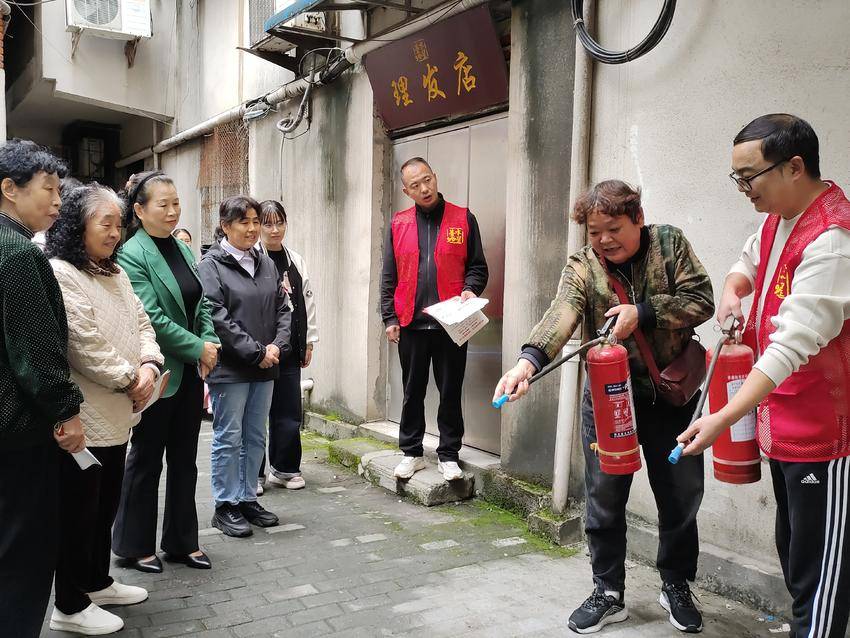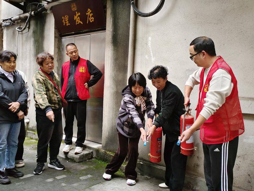 在实操环节,“小巷管家”们纷纷踊跃上前,按照宣讲员的指导,亲自体验灭火器的操作流程。“提、拔、握、压”,简单的四字口诀,却蕴含着关键的操作技巧。大家认真练习,迅速掌握了灭火器的使用方法。