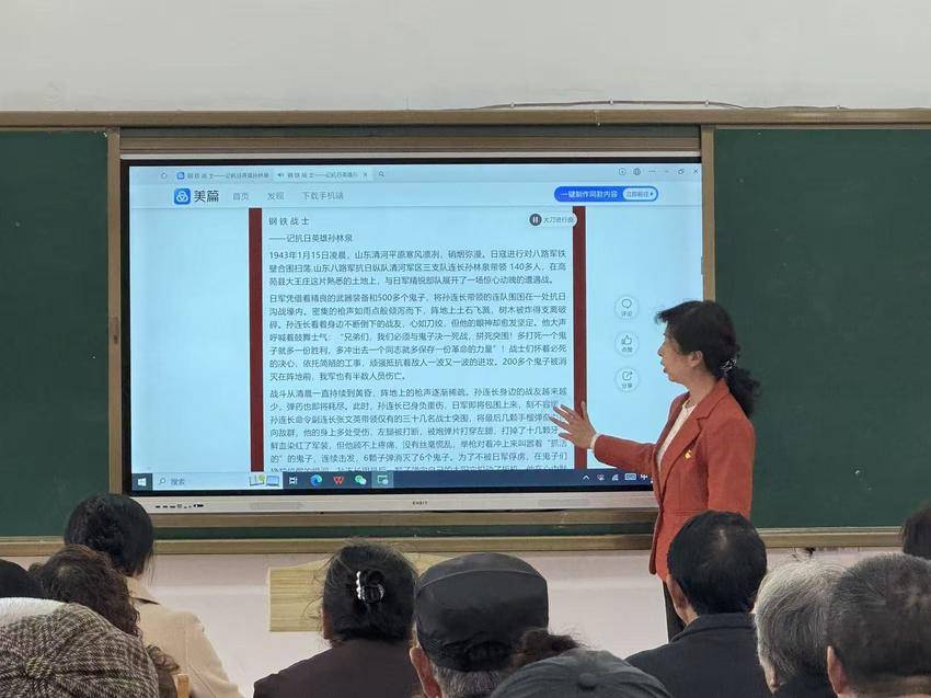 随后,现场播放铁路老年大学常务副校长周芹撰写的美篇《钢铁战士——记抗日英雄孙林泉》,通过珍贵史料还原孙林泉1943年率部在山东大王庄与日军激战、重伤拒降的英雄壮举。大家屏息凝视,仿佛穿越时空,亲眼见证了英雄为民族独立、人民解放的英勇身姿,深深被其不怕牺牲、忠贞报国的精神所震撼。