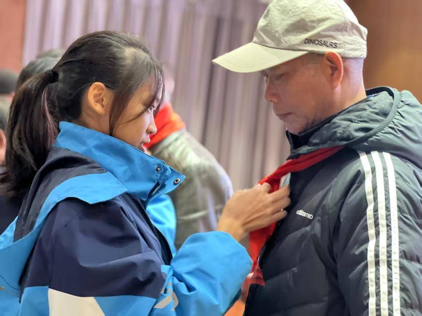 八年级(9)班学生代表李浩臣发表了《尊老敬老倡议书》,呼吁大家从身边小事做起,践行孝道,传承红色基因,弘扬孝亲文化。紧接着,学生们缓步上前,为退休教师佩戴上鲜艳的红领巾,一抹抹中国红映衬着满头银发,尽显尊崇与敬意。“感恩有您”环节中,退休教师代表深情回顾执教岁月,言语间满是对教育事业的眷恋与对学校发展的期许;学校领导送上诚挚祝福,在场人员温情合影,将感动瞬间永久定格。