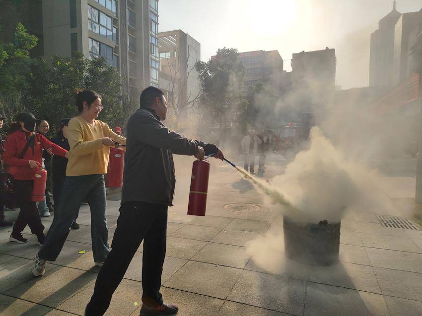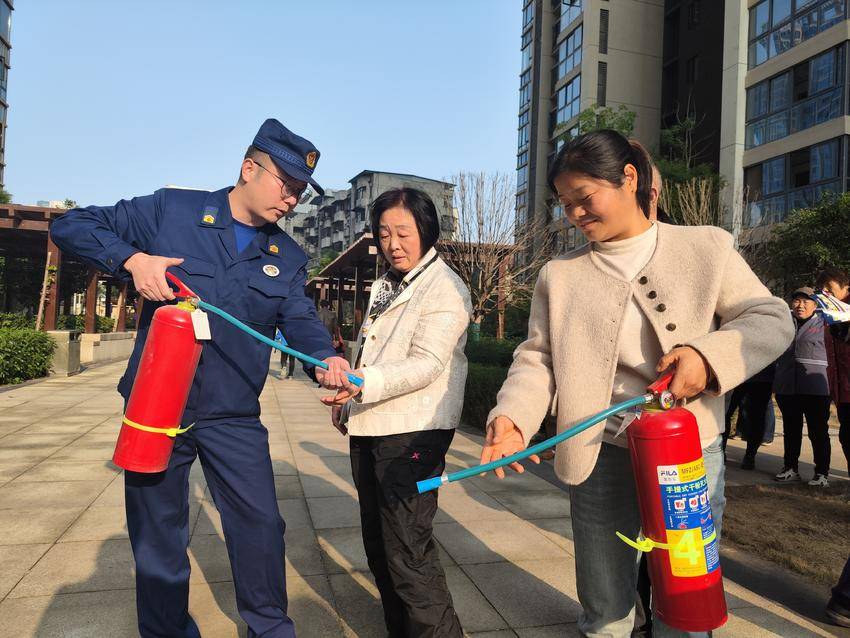 活动现场,消防宣传车滚动播放高层建筑火灾典型案例,以真实场景敲响安全警钟。消防员结合居民日常用火用电特点,用通俗语言讲解火灾预防要点、初期火灾扑救技巧及逃生自救知识,重点演示了灭火器“提、拔、握、压”操作方法。小区居民、沿街商户、物业保洁及保安等参训人员轮番上阵,在消防员指导下现场实操体验,切实掌握消防器材使用技能。