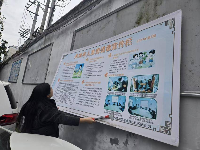 本网讯(通讯员王晶 实习记者熊斯祺)随着精神文明建设工作的持续推进,建华路社区内各类政策宣传、文明倡导、活动通知类展板数因长期风吹日晒雨淋,出现了画面褪色、边框锈蚀、纸张卷边等损坏情况,还有不少展板内容已过时效(如过期的节日活动通知、旧政策解读等),不仅失去了宣传意义,还破坏了社区整洁有序的环境,成为居民反映的 “小微痛点”。
