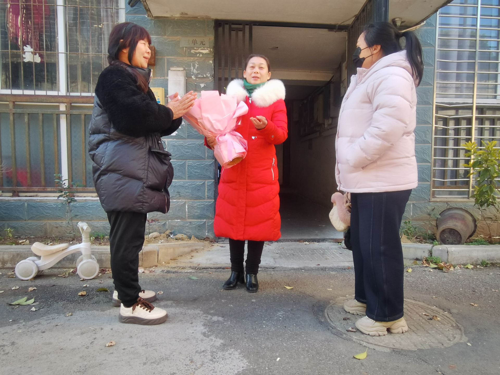 本网讯(通讯员 龚樊)近日,清河桥社区上演了一幕温暖人心的诚信故事,社区党员赵文芳在小区散步时拾得一个装有重要证件和现金的手提袋,主动上交社区并协助寻找失主。1月6日下午,社区工作人员陪同失主登门致谢,将一束感谢的鲜花送到赵文芳手中,表达由衷感激。